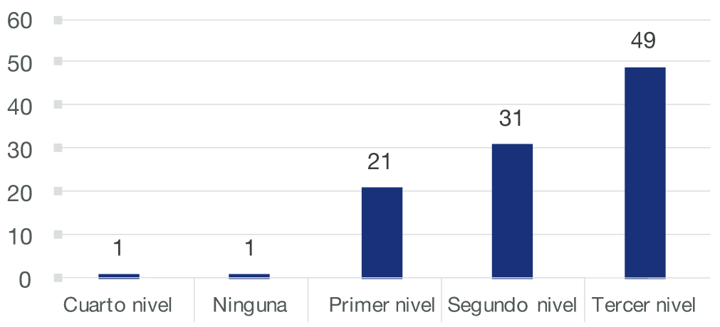 El estado civil del 58,3% (60;103) de las participantes fue casada. Figura 4.El 47,6% (49;103) de las participantes tuvieron estudios de tercer nivel, como se advirtió en la figura 5.
