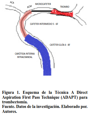 ECV: Enfermedad Cerebro Vascular; ADAPT: A Direct Aspiration First Pass Technique; HECAM: Hospital de Especialidades Carlos Andrade Marín; NIHSS: National Institutes of Health Stroke Scale; RM: Resonancia Magnética; ACM: Arteria Cerebral Media; M1: Segmento proximal; INR: International Normalized Ratio; TC: Tomografía Computarizada; HIP: Hemorragia Intraparenquimatosa; Angio-RM: Angio Resonancia Magnética; TICI: Thrombolysis In Cerebral Infarction; mRS: Escala de Rankin modificada; ASPECTS: Alberta Stroke Programme Early CT Score; Angio-TC: Angiotomografía Computarizada; AHA/ASA: American Heart Association/ American Stroke Association; FLAIR: Fluid attenuation inversion recovery; DWI-FLAIR: Diffusion weighted imaging/Fluid Attenuation Inversion Recovery; rTPA: Activador Recombinante de Plasminógeno; ACC: Arteria Carótida Común; ACI: Arteria Carótida Interna.