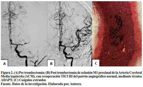 Caso1. Paciente, de género femenino, 47 años de edad, con antecedente de válvula cardíaca protésica y anticoagula-ción con warfarina, acude a la Unidad de Adultos Área de Emergencias del Hospital de Especialidades Carlos Andrade Marín (HECAM) con sintomatología de ictus cerebral, se aplicó la Escala de Accidente Cerebrovascular del Instituto Nacional de Salud National (NIHSS20), afasia global y hemiplejia facio-braquio-crural (F - B - C) derecha, de dos horas de evolución. Se realizó Resonancia Magnética (RM) cerebral (incluyendo Difusión y Angioreso-nancia a las secuencias convencionales) y se observó oclusión proximal de la Arteria Cerebral Media (ACM) izquierda, sin evi-dencia de restricción en difusión. Se procedió a realizar trombectomía mecánica con sistema ADAPT, reperfundiendo el área isquémica y logrando la recuperación del déficit neurológico, con un NIHSS de 2 post-trombectomía. Figura 2.