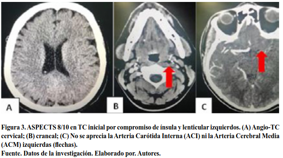 Respecto de la clasificación como ictus hemorrágico o isquémico inicial, y de este último según la categorización de Alberta Stroke Program Early CT Score (ASPECTS), la TC simple fue el estudio de imagen inicial para discernimiento4-6, con un score mayor a 7 en los casos de isquemia. Subsecuentemente se realizó RM y Angio-RM arterial en el primer caso, Angiotomografía Computarizada (Angio-TC) en el segundo y RM más An-gio-RM venosa en el tercero. A falta de disponibilidad de perfusión cerebral en TC y RM, se utilizó los hallazgos de los estudios descritos, coincidente con la recomendación de la última actualización de la American Heart Association/American Stroke Association (AHA/ASA) en las Guías de manejo temprano de Stroke 20191,17, donde se recomendó que si el núcleo (o core) del infarto (restricción en difusión) es más pequeño que un tercio del territorio de la arteria cerebral media y no hay cambio de señal visible en las secuencias Fluid Attenuation Inversion Recovery (FLAIR), el Mismatch Diffusion Weighted Imaging/Fluid Attenuation Inversion Recovery (DWI/FLAIR) sirve como un sustituto para el tiempo menor a 4,5 horas, además de la evidencia de oclusión de vaso mayor y el ASPECTS favorable (mayor a 7).