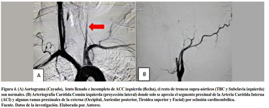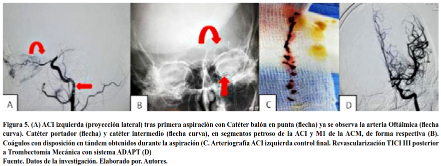 Caso 2. Paciente, de género masculino, de 31 años de edad, con antecedente activo de Miocardiopatía dilatada y anticoagulación con warfarina, International Normalized Ratio (INR) 3, acude a la Unidad de Adultos Área de Emergencias del HECAM con sintomatología e Ictus Cerebral, NIHSS 22 , afasia global y hemi-plejia F -B - C derecha, con 3 horas de evolución. Se realizó Trombectomía Me-cánica mediante ADAPT desde la carótida primitiva izquierda y subsecuentemente de la ACM ipsilateral, con reperfusión completa del área isquémica y recuperación del NIHSS a 3 pos trombectomía. Figura 3, 4 y 5.