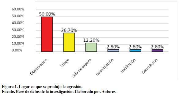 El lugar con más reportes de agresiones fue el Área de Observación 50% (88; 175), seguido en el triage 26,7% (47; 175), y sala de espera 12,2% (21; 175).