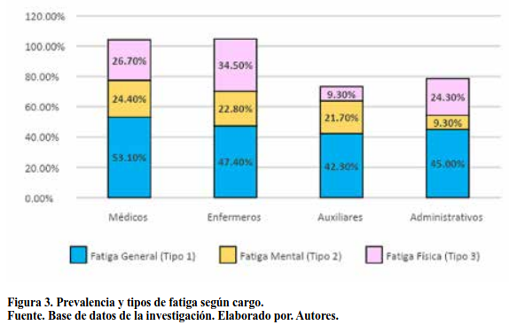 El tipo de fatiga más frecuente fue la fatiga general con 53,1% (24; 45) en los médicos, 47,4% (36; 76) en los enfermeros, la fatiga física estuvo presente en los enfermeros en un 34,5% (26; 76), en los médicos en un 26,7% (12; 45), y la fatiga mental afectó a los médicos en el 24,4% (11; 45), y por último en los enfermeros en un 22,8% (17; 76).