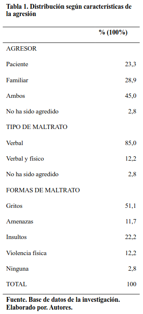 En esta investigación, la mayoría de los trabajadores analizados reportaron ser víctimas de agresiones en el lugar de trabajo. En la mayoría de los casos; las agresiones fueron por parte del paciente como del familiar (ambos), seguido de solo el familiar en 28,9%. En cuanto al tipo de maltrato más común reportado fue el verbal, los gritos y los insultos fueron los más predominantes. El motivo de agresión principal fue el tiempo de espera prolongado para la atención.
