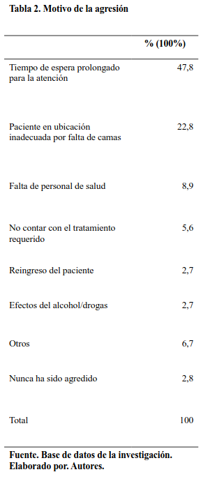 Según datos de la Organización Panamericana de la Salud, 2017; los trabajadores de instituciones públicas son más vulnerables a este tipo de agresiones y, el departamento de emergencias es el que más eventos ha reportado4. Estas agresiones son causadas por la demora en la atención médica en el 44,2% de los casos; por la no disponibilidad de medicamentos u otros recursos en el 33,6% por la muerte de un familiar o paciente, en el 8,6%20,22. En comparación con este estudio en donde se reportó que el motivo de agresión más predominante fue el tiempo de espera prolongado para la atención con un 47,8% (84; 175).