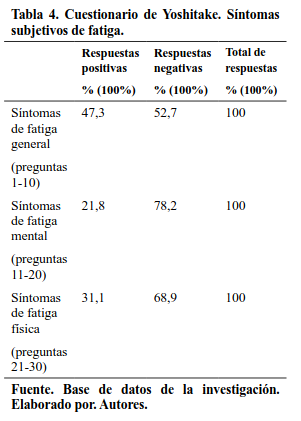 Los síntomas de fatiga general, tuvieron el mayor porcentaje de respuestas positivas, un 47,3% (85; 180), en comparación con los síntomas de fatiga física que se reportó en el 31,1% (56; 180) y los síntomas de fatiga mental en un 21,8% (39; 180).