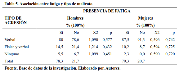 No se estableció una asociación estadísticamente significativa entre el tipo de agresión y la fatiga tanto en hombres como mujeres que participaron en esta investigación (p<0,05).