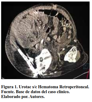 En la Unidad de Adultos Área de Emergencias se interconsultó a la Unidad Técnica de Urología, se solicitó exámenes de imágenes, Urotomografía simple y contrastada (Urotac s/c), con lo cual se diagnosticó al paciente con Hematoma Retroperitoneal. Figura 1. Se decidió su ingreso a la Unidad Técnica de Urología para compensación hemodinámica y posterior resolución quirúrgica; además, se pidió valoración por la Unidad Técnica de Nefrología para apoyo dialítico y manejo de su Enfermedad Renal Crónica, así como apoyo a las Unidades Técnicas de: Neumología, Gastroenterología y Hematología para tratamiento integral.