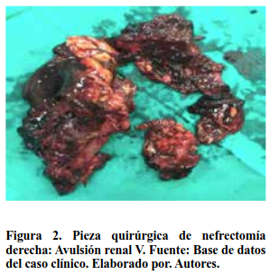 En la Historia Clínica del sistema AS400 se registró como diagnóstico postquirúrgico hematoma retroperitoneal + trauma renal grado V (avulsión renal); como cirugía realizada se reportó una nefrectomía simple derecha + suprarrenalectomía derecha + drenaje de hematoma retroperitoneal; dentro de los hallazgos se encontró un hemoperitoneo de aproximadamente 1 000 cc, no se identificaron lesiones intestinales, hematoma retroperitoneal en zona derecha; además en la exploración se observó una colección hemática organizada de aproximadamente 2 000 cc, riñón derecho con parénquima abierto en su totalidad en 4 fragmentos, hilio renal: 2 venas y 1 arteria íntegros, glándula suprarrenal derecha con sangrado activo en sábana. Figura 2.