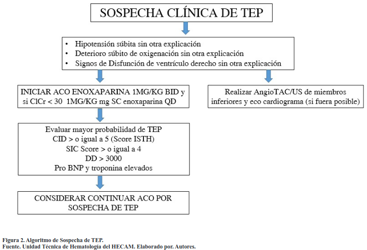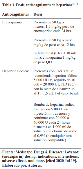 Deberá iniciar enoxaparina a dosis anticoagulantes (Tabla 3) a todo paciente con hipotensión y deterioro súbito de oxigenación y con signos de disfunción de ventrículo derecho sin otra explicación en el que se piensa sobreinfección o si el paciente tenía ya una sobreinfección previa, la procalcitonina esté disminuyendo o sea negativa.