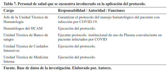 The group of Hematologists from the hospitals of the city of Quito: Specialties Carlos Andrade Marín HECAM-IESS, Metropolitano; and, hospitals in the city of Guayaquil: Teodoro Maldonado Carbo-IESS, Luis Vernaza Hospital and Gilbert Clinic, based on the available scientific evidence and professional expertise, prepared this protocol with the recommendations according to the different hematological scenarios and complications.