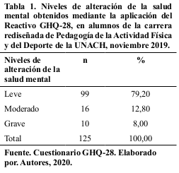 INTRODUCTION. Mental and substance use disorders cause 19% of all disabilityadjusted life years and 36% of all years lived with disability. They account for one-third of the total burden of disease in the population aged 10-45 years. OBJECTIVE. To analyze mental disorders and alcohol consumption in university students. MATERIALS AND METHODS. Cross-sectional, analytical, field study. Population and known sample of 125 university students from first to fifth semester of the redesigned career of Pedagogy of Physical Activity and Sport of the National University of Chimborazo, November 2019. The technique used for data collection was the Psychological Reactive. The following were applied: Alcohol Use Disorders Identification Test - AUDIT and General Health Questionnaire GHQ-28. Frequency and percentage of mental health and alcohol consumption disorders were calculated. Data were tabulated and the association was analyzed with the Chi-square χ² statistic. RESULTS. 79,2% (99; 125) had a mild level of mental health disturbance; 72,8% (91; 125) did not reflect problems related to alcohol consumption; significant association was found between levels of mental health disturbance and alcohol consumption. CONCLUSION. An significant association was found between mental disorder and alcohol consumption, with low levels of mental health impairment and absence of alcohol-related problems.
