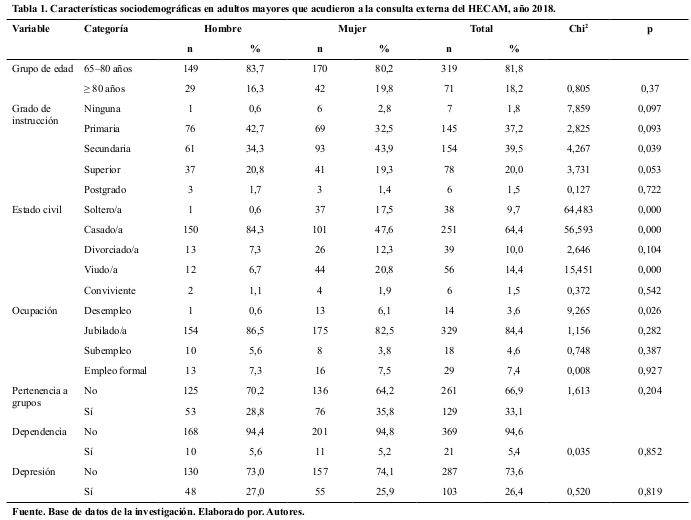 Se presentó ED en el 26,4% (103; 390) de casos, en este porcentaje la encuesta MINI registró 15,4% (60; 103) episodio depresivo leve; 7,7% (30; 103) episodio depresivo moderado; y, 3,3% (13; 103) episodio depresivo severo. El 76,7% (299; 390) tuvo grado de instrucción primaria y secundaria. Un 60,0% (93; 154) de mujeres frente a un 40,0% (61; 154) de hombres cursó la secundaria, el valor fue significativo. La relación de hombres y mujeres casados fue de 2 a 1; sin embargo, hubo tres veces más mujeres viudas, lo que se puede explicar por la mayor esperanza de vida en las mujeres. De los jubilados 84,4% (329; 390) y un 7,4% (29; 390) tenían empleo formal. Dos tercios de personas no pertenecían a grupos sociales organizados. 5,4% (21; 390) eran dependientes para realizar actividades de la vida diaria.