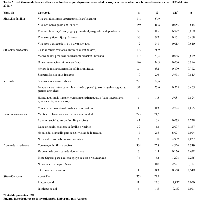 En las variables de la Escala de Gijón, solo el 37,9% (148; 390) vivía con familia y sin dependencia y apenas el 8,8% (34; 390) recibía menos de 380 dólares mensuales o sin pensión. La mayoría vivió en casas con condiciones aceptables y servicios básicos. Variables significativas asociadas a depresión fueron: vivir con familia y/o cónyuge con algún grado de dependencia, no tener pensión u otros ingresos, vivienda con humedades y en mala higiene, no salir del domicilio, no recibir visitas, vivir en riesgo y problema social. Tabla 2.