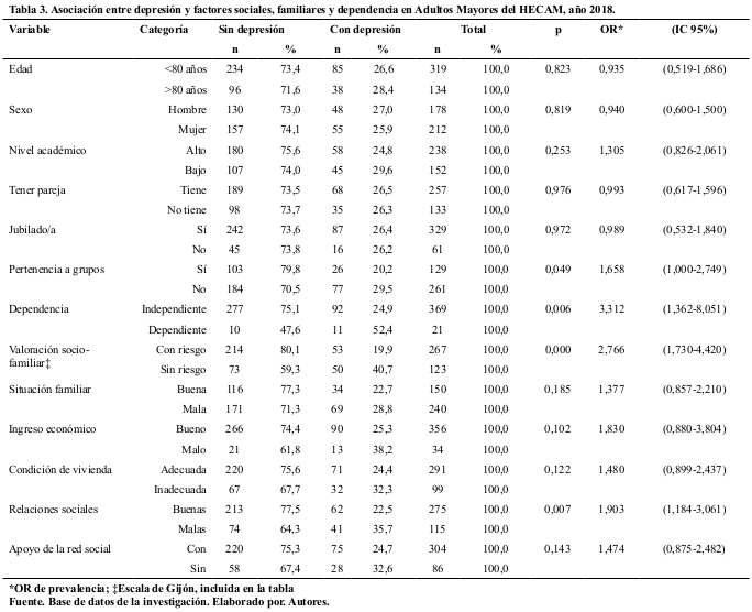 La dependencia y la no pertenencia a grupos sociales tuvieron valores significativos, adultos mayores dependientes 3,3 veces más probabilidades de desarrollar depresión y los que no pertenecen a grupos de la tercera edad 1,66 veces. La valoración socio familiar medida por Escala de Gijón fue significativa, es decir, personas que vivían en riesgo y problema social podrían deprimirse de forma fácil, es decir, 2,8 veces más que las personas con situación social aceptable. De las variables de la Escala de Gijón, la de mayor peso fue el tener malas relaciones sociales (p: 0,007).
