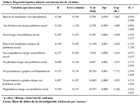 Las interacciones con mayor significancia se encontraron entre dependencia con riesgo social, no pertenecieron a grupos con riesgo social ni a grupos con dependencia, bajo nivel académico con riesgo social y, el ser mujer se torna significativo cuando interactúa con riesgo social. Tabla 5.