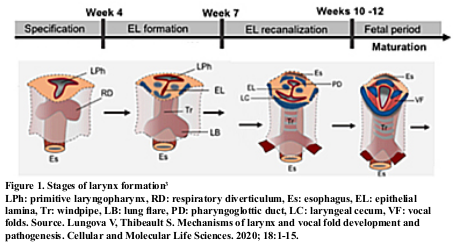 During embryological development, the larynx and vocal cords (VC) meet at the confluence of the digestive and respiratory tracts3. In the 12th week of gestation, the primitive laryngopharynx is compressed bilaterally with its lateral walls approaching the center of the lumen, which will eventually merge and give rise to the epithelial lamina, which after a reorganization stage will form the tracheoesophageal septum that would disintegrate to form the laryngotracheal tube3. Finally, a ventral (laryngeal) and dorsal (pharyngoepiglottic) recanalization event occurs.