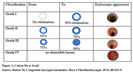 The subglottic stenosis is another congenital cause; it is evaluated with the Cotton Myer scale (Figure 2), it comes from a failure in the recanalization of the laryngeal lumen at week12; it is defined as a lumen 4,0 mm in diameter or less at the level of the cricoid in a full-term newborn7.