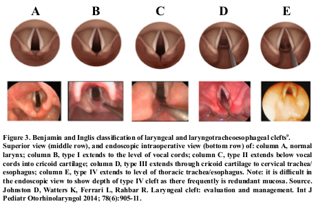 The laryngeal cleft represents 0,5 to 1,5%8 of all malformations; it is the incomplete separation between the esophagus and the airway from the beginning of the larynx, due to abnormal fusion of the posterior cricoid lamina and defective development of the tracheoesophageal septum. It is classified in 4 degrees (Figure 3)9. The clinical treatment is indicated in grade I (food thickening, swallowing rehabilitation and treatment of gastroesophageal reflux) which may eventually be associated with laryngoplasty injection and endoscopic repair. From grade II on, its resolution is purely surgical, preferably endoscopic10 and the open surgical technique is used mostly for grade III-IV (70,0% of cases)10.