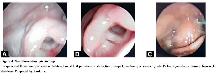 51,51% of the cases were men (17; 33). The age at the first consultation in the first month was 18,18% (6; 33), between the first 3 months 40,00% (13; 33), at 6 months 55,10% (18; 33) and 96,96% (32; 33) in the first year. The diagnosis was made within 15 days after the first appointment by flexible nasofiber endoscopy in 88,00% (29; 33) of the cases (Figure 4) and 12,12% (4; 33) by bronchoscopy. 65,50% (22; 33) of these studies were carried out in the hospital, the difference was referred to an external provider. The evaluation was completed in 4 patients with 3D airway tomography (subglottic and tracheal stenosis) to assess the extent of the stenosis.