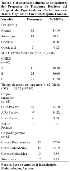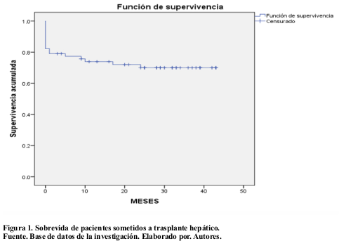 Estudio observacional, descriptivo con una población y muestra conocida de 62 datos de Historias Clínicas del Programa de Trasplante Hepático de la Unidad de Trasplante del Hospital de Especialidades Carlos Andrade Marín en el período mayo 2016 a diciembre 2019. Criterios de inclusión: pacientes sometidos a trasplante hepático, previa obtención del Consentimiento Informado, Confidencialidad de Datos y autorización del Comité de Ética en Investigación en Seres Humanos (CEISH), con seguimiento durante 43 meses. La información se recolectó de la base de datos de las Historias Clínicas de cada paciente registradas en el sistema AS400 del hospital, para el análisis de los datos se aplicó el programa estadístico International Business Machines Statistical Package for the Social Sciences, (IMB SPSS) versión 23.0 y se utilizó el estimador Kaplan-Meyer.