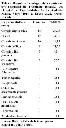 Dentro de los diagnósticos etiológicos, las principales causas fueron: cirrosis criptogénica y el Nonalcoholic Steatohepatitis (NASH) y las menos frecuentes fueron: poliquistosis hepática, amiloidosis familiar y la hiperoxaluria. Tabla 2.