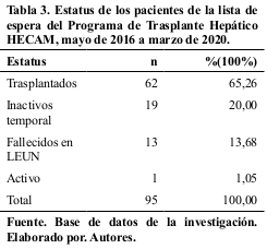 El total de trasplantes hepáticos realizados fue 65,26% (62; 95), el 34,73% (33; 95) restante correspondieron a los pacientes inactivos temporal, activo y fallecidos.
