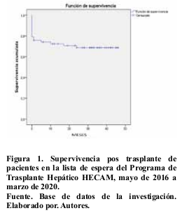 La supervivencia global del post trasplante fue de 72,5% a los 12 meses y del 69,4% a los 46 meses de forma respectiva. Figura 1.