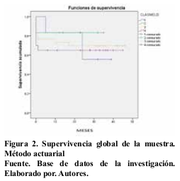 Para la validación de MELD y estimación del valor predictivo de esta escala, se implementó un análisis de curva ROC. Para el análisis de sobrevida se utilizaron el modelo actuarial, y el modelo de Kaplan-Meier, se verificó la significancia estadística a través del estadígrafo Log-Rank (p < 0,05).
