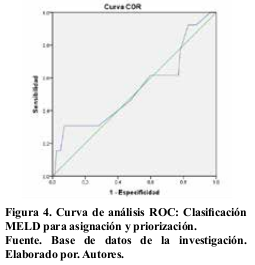 En la comparación de las clasificaciones mediante el análisis de curvas de sobrevida se obtuvo un área bajo la curva de 0,59% para MELD. Figuras 3 y 4.
