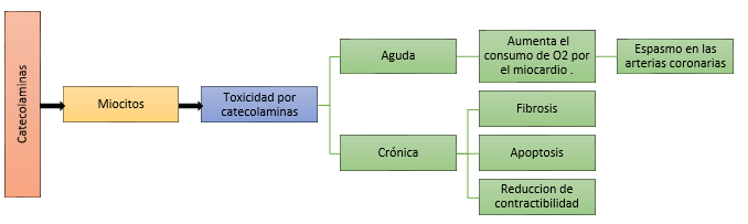 La estimulación excesiva inducida por catecolaminas a los miocitos cardíacos conduce a daños estructurales. La exposición crónica a las catecolaminas resulta en fibrosis, apoptosis de los miocitos y reducción de la contractibilidad que se manifiesta en varias formas de miocardiopatía que va desde miocardiopatía de Takotsubo (MT) hasta miocardiopatía dilatada (MCD). Figura 1.