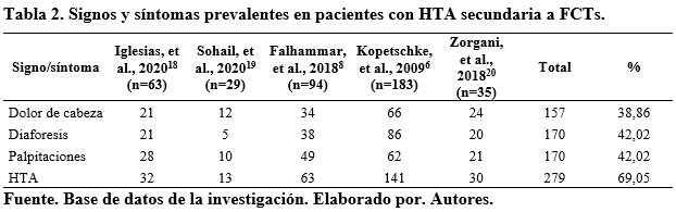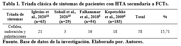 La hipersecreción episódica hormonal puede resultar en una tríada clásica de síntomas: dolor de cabeza, sudoración y palpitaciones, reportada en un aproximado del 25% de los pacientes con FCTs15. Esta tríada junto a HTA de manera concomitante tiene una especificidad diagnóstica superior al 90%16,17. En esta revisión analizamos 4 estudios retrospectivos, donde el 15,71% (58; 369) de pacientes presentaron la triada clásica6,8,18. Tabla 1.