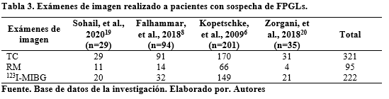 La literatura menciona que la gammagrafía con 123I-MIBG tiene una especificidad diagnóstica en extremo alta del 95-100% y una sensibilidad del 77-90%22. En la presente revisión se evidenció una sensibilidad que varió del 81,90-100%18- 20. Además, se analizaron los exámenes de imagen realizados en 4 estudios con una población de 359 pacientes, se evidenció que el examen realizado con mayor frecuencia es la TC. La sensibilidad y especificidad no se detallan en dichos estudios, por lo que no se mencionan. Tabla 3.