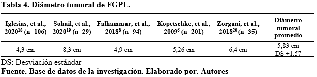 En cuanto al diámetro tumoral, en la tabla 4 se muestran las dimensiones analizadas en 5 estudios con un total de 404 pacientes.