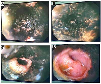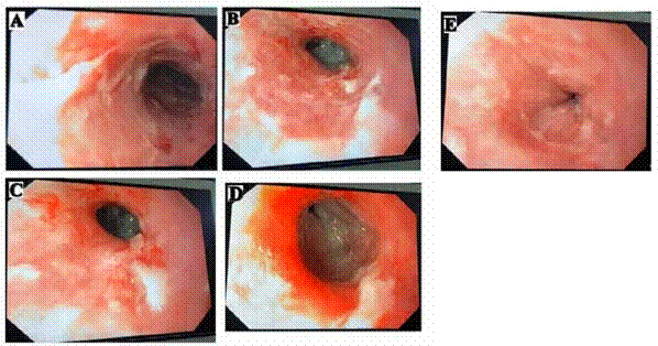 Mucosa del esófago en todo su trayecto de proximal a distal (2A, 2B, 2C, 2D y 2E) y circunferencia eritematosa, friable, con exudado fibrinoide y áreas con aspecto fibrótico.