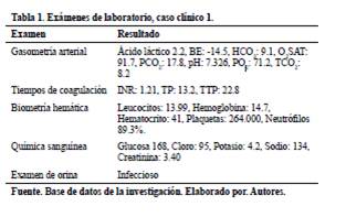 Paciente masculino de 74 años con antecedentes patológicos de hiperplasia prostática benigna, hipertensión arterial esencial, en- fermedad renal crónica estadio 3A, antecedente quirúrgico de laparotomía exploratoria por perforación cecal, peritonitis gene- ralizada, tumor de unión recto-sigma perforado que se le realizo lavado de cavidad, resección anterior, colostomía, cecectomía, ileostomía terminal, el diagnóstico histopatológico fue de un adenocarcinoma moderadamente diferenciado con un estadiaje T3 N0 Mx con compromiso de mesorecto, presenta examen de CA-125 elevado probablemente por proceso quirúrgico a des- cartar metástasis a distancia en tratamiento con quimioterapia ad- yuvante versus paliativo por duda diagnóstica esquema XELOX con tres ciclos con buena tolerancia. Ingresó por emergencia del Hospital de Especialidades Carlos Andrade Marín por presentar tres días después de su último esquema de quimioterapia ma- lestar, astenia, hiporexia; presentó dos crisis convulsivas y me- lenas por funda de ileostomía. En el examen físico de ingreso: taquicárdico, hipotenso, caquéctico, deshidratado; en estudios complementarios (Tabla 1): hiperlactatemia, acidosis metabó- lica, leucocitosis, neutrofilia, injuria renal aguda y un examen elemental y microscópico de orina infeccioso.