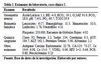 parcial de oxigeno; TCO2: total dióxido de carbono; INR: índice internacional normalizado; TP: tiempo de protombina; TTP: tiempo de tromboplastina parcial; AST: aspartato aminotransferasa; ALT: alanina aminotransferasa; CA-125: antígeno de cáncer 125; VDRL: Laboratorio de Investigación de Enfermedades Venéreas; VIH: virus de la inmunodeficiencia humana; PCR: proteína C reactiva; CA 19-9: antígeno carbohidrato/ antígeno