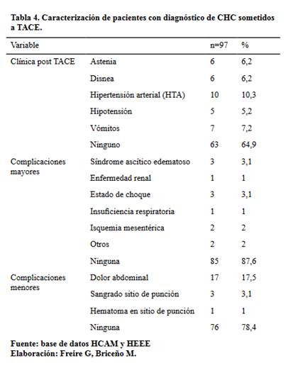 La mayor parte de los pacientes no presentaron complicaciones, sin embargo, aquellos que las presentaron entre las más frecuentes fueron: clínica post TACE, la HTA en el 10.3%; complicaciones mayores: el síndrome ascítico edematoso y el estado de choque en el 3.1%; complicaciones menores: el dolor abdominal en el 17% (Tabla 4).