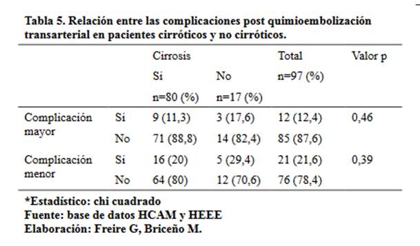 INTRODUCTION: Transarterial chemoembolization has been shown to improve the survival rate in patients with hepatocarcinoma, it has been described as palliative treatment; it is useful, effective and well tolerated. This therapy aims to reduce tumor volume, due to its embolic, vascular and cytotoxic effects. OBJECTIVE: To determine the complications presented by patients diagnosed with hepatocarcinoma, after performing transarterial chemoembolization of the Gastroenterology service of the Carlos Andrade Marín Specialty Hospital and Eugenio Espejo Specialty Hospital, during the period January 2015 - January 2020. METHODOLOGY: This cross-sectional observational study was conducted in patients with hepatocarcinoma who underwent transarterial chemoembolization. A form was designed for the collection of information, through a pseudonymized database, which was analyzed using the statistical package SPSS version 26.