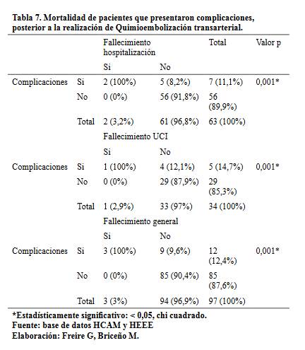 Se puede apreciar que la asociación entre mortalidad y complicaciones post TACE en hospitalización fue del 3,2% y en UCI del 2,9%; con una tasa general de 3,2% dicha relación fue estadísticamente significativa (Tabla 7).