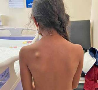Paciente mujer de 8 años de edad, autoidentificada como mes- tiza, que no presentaba antecedentes personales clínicos ni quirúrgicos de relevancia, sin historial de neoplasias óseas en su familia. Madre refiere que hace 3 años apareció una masa en región de tórax posterior a la altura del tercio proximal de omóplato izquierdo. La paciente es valorada, en un primer momento, por el centro de salud de la localidad donde vivía y se refirió el caso al servicio de Traumatología pediátrica del Hospital General de la Provincia que decidió el ingreso para su estudio.
